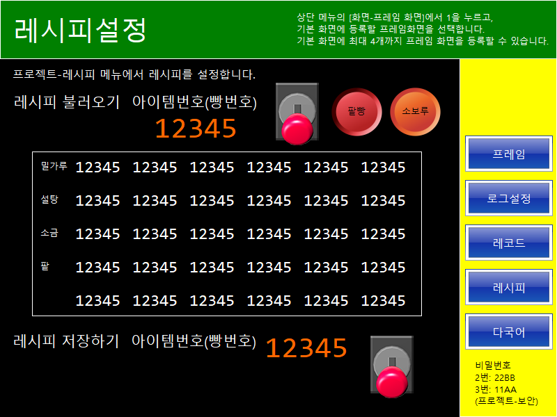 레시피 설정, 파라미터 다운로드, 파라미터 업로드 기능 예제입니다.